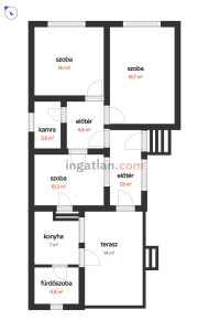 Elrendezés: 3 világos szoba, tágas fürdőszoba, konyha, nagy előszoba, fedett terasz
